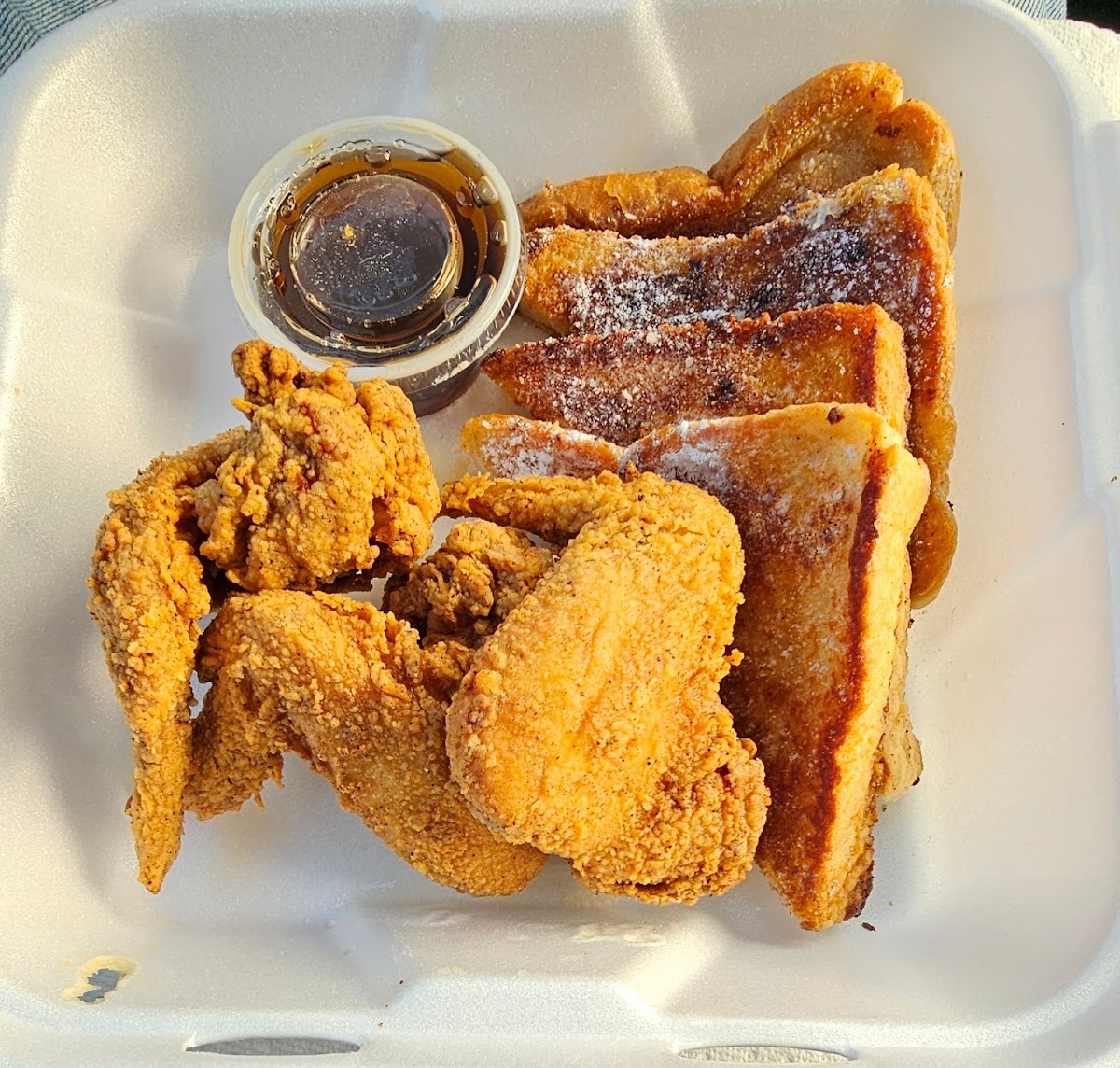 I've been scoping out this place for a minute, and I finally gave it a try today. It's a decent size place and very clean with a chill atmosphere. The music was nice as well. I got the 3 wing plate with french toast. The wings were seasoned well and super delicious! The French toast had a flavor in it that I didn't recognize, but it was really good as well. The food is made fresh so there will be a small wait time. I will try some of the other menu items in the future!!